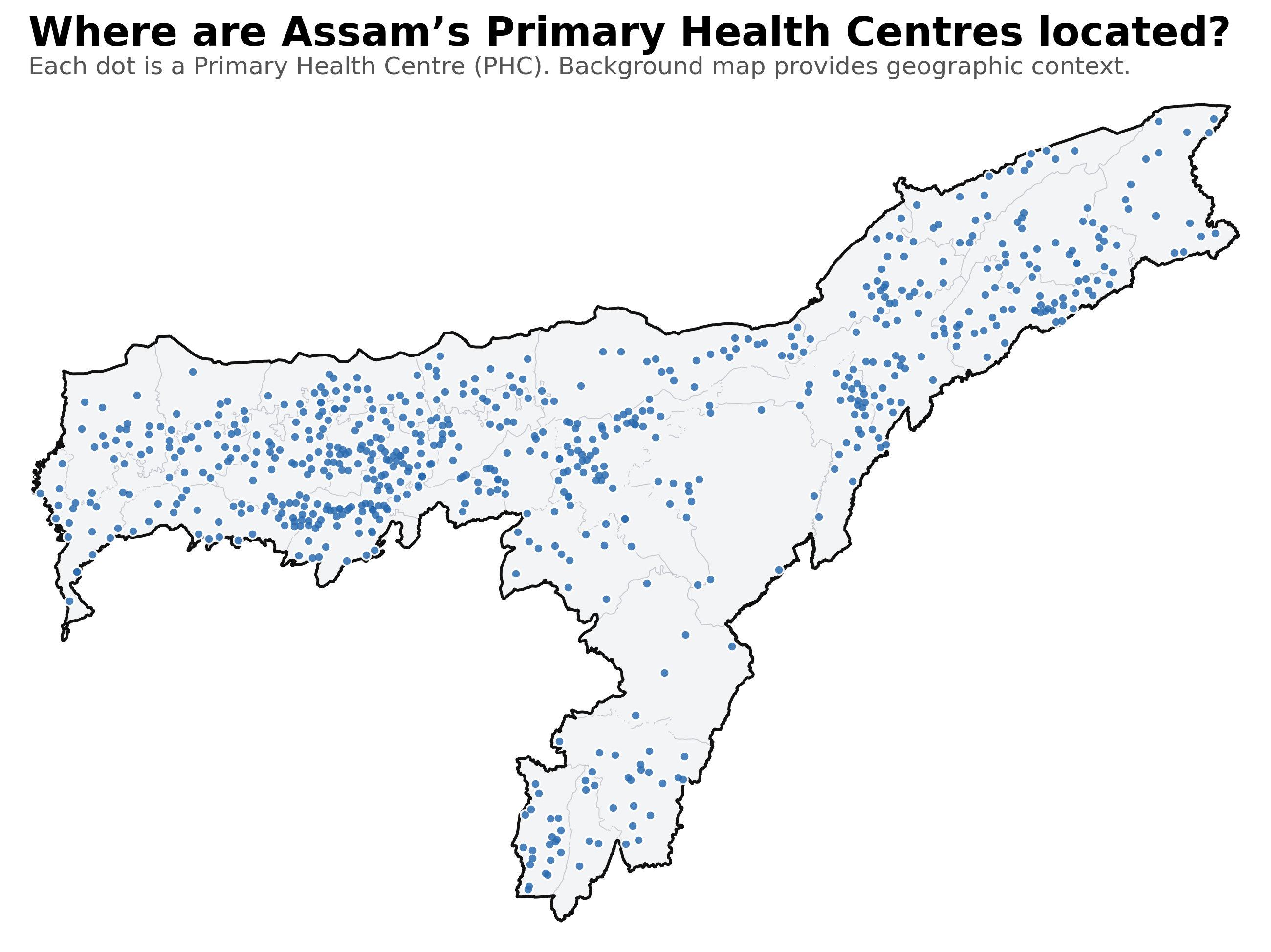 Assam has hundreds of Primary Health Centres (PHCs). Plotting them on a map shows how they span the Brahmaputra valley and hill districts.